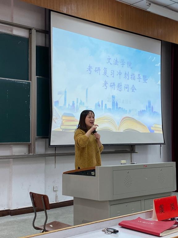 虞岚老师先代表学院,向考研同学发放了慰问品,也表达了最亲切的关怀。她与考研同学分享了三点希望:第一,希望同学们能够永远记得老师是你们最坚强的后盾,遇到问题时要及时和老师联系交流;第二,希望同学们在考研最后的一个月里调整好心态;第三,希望同学们注意劳逸结合。最后虞岚老师送给同学们一句话:相信自我,坚定理想,不怕苦难,顽强拼搏,并衷心祝愿同学们能够完成人生理想的抱负。